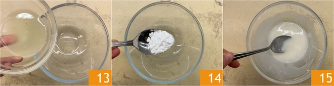 Pendant que les madeleines refroidissent, préparez le glaçage : versez le jus de citron filtré 13 et le sucre glace dans un petit bol 14, puis mélangez jusqu'à obtenir un glaçage de consistance moyenne 15. Ajustez la quantité de citron en fonction de la consistance du mélange.