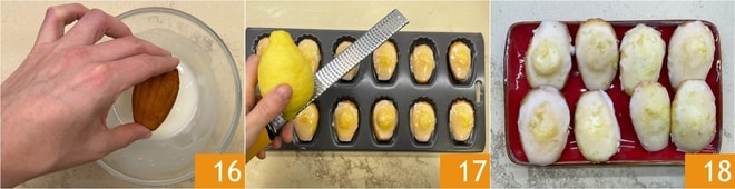À ce stade, trempez le côté lisse des madeleines dans le glaçage 16 et remettez-les dans le moule. Décorez avec le zeste de citron râpé 17 et laissez sécher. Vos madeleines glacées sont prêtes à être servies 18 !