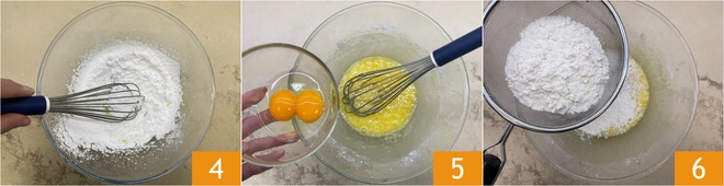 Mélangez avec un fouet à main 4, puis incorporez les œufs un à un 5. Mélangez pour les intégrer, en veillant à ne pas incorporer d'air. Tamisez la farine dans le bol en 2 fois 6 et incorporez-la avec le fouet.