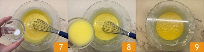 Ajoutez également une pincée de sel 7. Enfin, versez le beurre fondu tiédi 8 et mélangez rapidement le tout. Couvrez de film plastique et laissez reposer la pâte au réfrigérateur pendant environ une heure et demie 9.