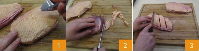 Pour préparer le magret de canard au balsamique, commencez par retirer les plumes du magret, il vous suffira de les arracher avec une pince à épiler 1. À ce stade, éliminez l'excès de graisse à l'aide d'un couteau 2 et procédez à faire des entailles d'abord en biais 3
