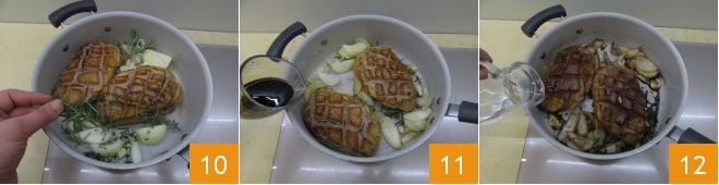 Ajoutez le thym, le romarin 10 et déglacez avec le vinaigre balsamique 11. Laissez légèrement évaporer puis ajoutez également l'eau 12 (ou si vous préférez, le bouillon de légumes).