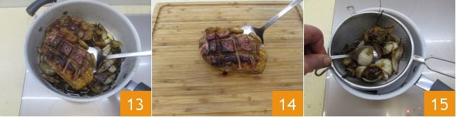 Cuisez le magret de canard pendant une dizaine de minutes (il doit rester rosé à l'intérieur) puis transférez-le sur une planche à découper (13-14) en gardant de côté le jus de cuisson, que vous verserez dans une passoire. Filtrez le liquide en pressant le mélange avec une cuillère 15 directement dans la même poêle où vous avez cuit le magret de canard.