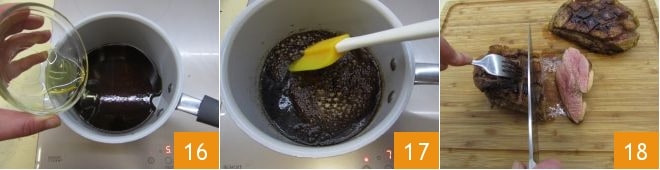 Ajoutez également le miel 16 et cuisez pendant 3-4 minutes pour obtenir une sauce 17. Pendant ce temps, coupez le magret de canard en tranches 18
