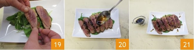 et disposez les tranches sur un lit de mesclun 19. Complétez le plat avec la petite sauce fraîchement préparée 20 et servez votre magret de canard au balsamique 21.