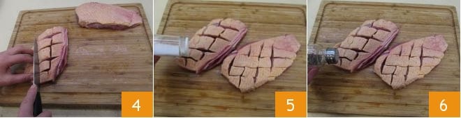 et ensuite verticalement 4. Répétez la même opération pour l'autre magret, puis salez 5 et poivrez 6 des deux côtés.