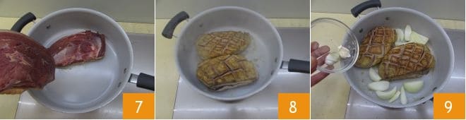 Placez une poêle sur le feu et laissez-la chauffer, lorsqu'elle sera bien chaude, déposez-y les magrets de canard, côté peau 7. Après 3-4 minutes, retournez-les 8 et laissez-les dorer de l'autre côté. À ce stade, ajoutez l'oignon épluché coupé en quartiers et l'ail en chemise 9.