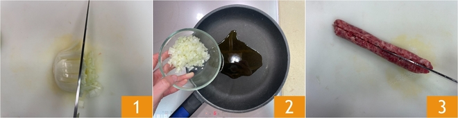 Pour préparer les malloreddus à la campidanese, commencez par la sauce : épluchez et hachez l'oignon 1. Dans une poêle antiadhésive, faites revenir l'oignon avec un filet d'huile 2. Pendant ce temps, incisez la saucisse pour retirer le boyau 3.