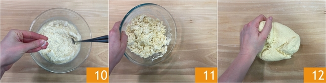Ajoutez également une pincée de sel 10. Mélangez d'abord avec une fourchette, puis transférez la pâte sur le plan de travail 11 et pétrissez à la main jusqu'à obtenir une pâte lisse 12. Laissez reposer la pâte pendant 15-20 minutes, couverte avec un bol.