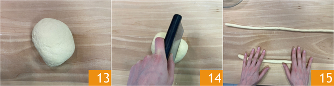 Après le temps de repos 13, divisez la pâte en petits morceaux 14 et formez des petites bandelettes de pâte d'environ 5 mm de diamètre 15.