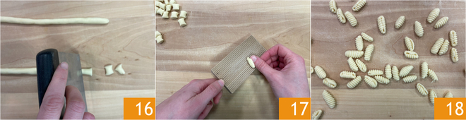 Il est important de ne pas ajouter d'autre farine pour former les gnocchetti, sinon la pâte deviendrait difficile à travailler. Avec une corne, coupez les bandelettes en morceaux d'environ 8 mm 16, puis passez-les sur le rigagnocchi, en tenant la partie coupée vers le haut 17. Continuez ainsi jusqu'à épuisement de la pâte 18.
