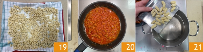 Disposez les malloreddus sur un torchon légèrement fariné ou sur le plan de travail fariné 19. Entre-temps, la sauce sera prête 20, alors faites cuire les gnocchis dans de l'eau bouillante salée 21.
