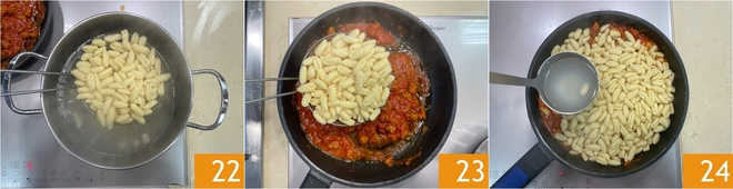 Égouttez les malloreddus dès qu'ils remontent à la surface 22, transférez-les dans la sauce 23, ajoutez une louche d'eau de cuisson 24 et mélangez pour amalgamer, puis éteignez le feu.