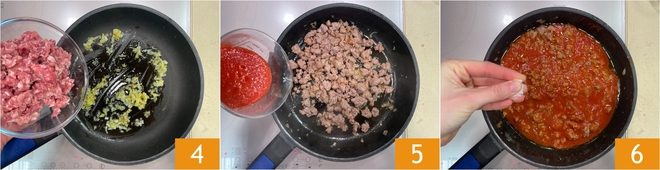 Une fois que l'oignon est doré, ajoutez la saucisse émiettée à la main 4. Faites-la revenir pendant quelques minutes, puis ajoutez la purée de tomates 5 et salez 6.
