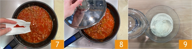 Assaisonnez avec le safran en poudre 7, mélangez bien, couvrez avec un couvercle 8 et laissez cuire à feu moyen-doux pendant environ 20 minutes. Pendant ce temps, préparez les malloreddus : dans un bol, mélangez la semoule remoulue et environ les deux tiers de l'eau 9. Le reste de l'eau sera utilisé uniquement si nécessaire.