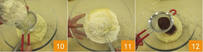 Maintenant, prenez le bol avec le plus de pâte et ajoutez 50 g de farine supplémentaires, en la tamisant avec une passoire 10. Mélangez bien 11 pour incorporer toute la farine et mettez-la de côté un instant. Ensuite, prenez le bol avec l'autre pâte et ajoutez les 10 g de cacao amer, toujours en le tamisant avec une passoire 12.