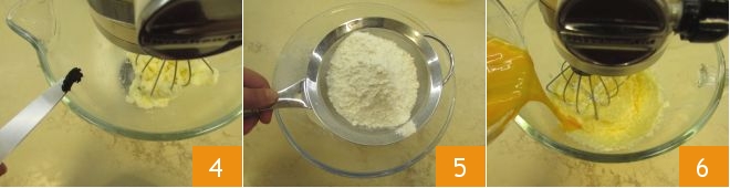 Démarrez le robot et ajoutez également les graines d'une gousse de vanille 4. Pendant que le robot fonctionne, tamisez les 300 g de farine avec la levure 5 et mettez-les de côté. Cassez les œufs, battez-les avec une fourchette puis versez-les petit à petit dans le robot en marche 6.