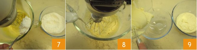À ce stade, vous pouvez incorporer les poudres tamisées précédemment, une cuillère à la fois 7 et, une fois qu'elles seront complètement amalgamées, versez également le lait à température ambiante en filet 8. Une fois que vous aurez obtenu une pâte homogène, arrêtez le robot et divisez la pâte en deux bols : dans le premier, versez 2/3 de la pâte, dans le second bol le reste 9.