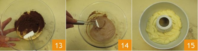 Mélangez bien 13 jusqu'à ce que le cacao soit complètement intégré 14. Beurrez et farinez un moule à gâteau marbré de 23 cm de diamètre et commencez à verser la moitié de la pâte claire 15. Répartissez la pâte claire de manière uniforme, en remplissant le moule environ d'un tiers.