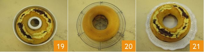 Sortez le gâteau du four 19 et, une fois refroidi, démoulez-le en renversant le moule sur une grille 20. Retournez à nouveau le gâteau sur un plat de service, de manière à montrer à la fois la pâte claire et la pâte foncée 21 puis servez : votre gâteau marbré bicolore est prêt à être dégusté !