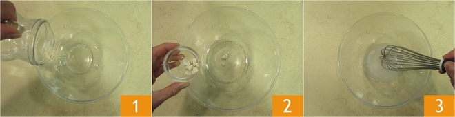 Pour préparer les maritozzi, la première chose à faire est de préparer le levain. Dans un bol, versez l'eau 1, ajoutez la levure 2 et mélangez avec un fouet jusqu'à dissolution 3.
