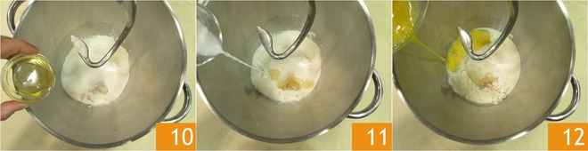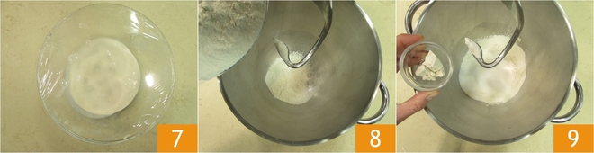 Laissez-le maturer pendant 2 heures à une température d'environ 30°C : le four éteint avec la lumière allumée fera l'affaire 7. Lorsque le levain aura doublé de volume, versez la farine dans le bol d'un robot pâtissier équipé d'un crochet 8, ajoutez la levure émiettée 9.