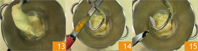 Travaillez le mélange jusqu'à ce qu'il soit bien lisse 13. Ajoutez le zeste d'orange râpé, en veillant à ne prendre que la partie orange 14 et les graines d'une gousse de vanille 15.
