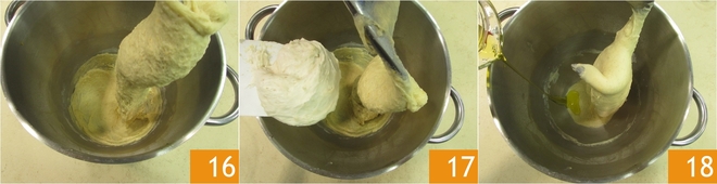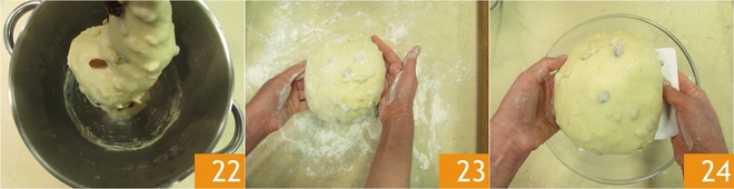 Continuez à pétrir jusqu'à ce qu'ils soient bien incorporés 22. Transférez ensuite la pâte sur un plan de travail 23, formez une boule et placez-la dans un bol 24.