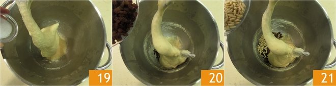 Lorsqu'elle est bien absorbée, ajoutez le sel 19, les raisins secs 20 et les pignons 21.