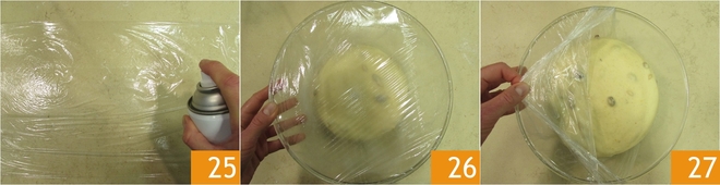 Huilez légèrement un morceau de film alimentaire 25 et utilisez-le pour sceller le bol 26. Laissez lever pendant 2 heures à température ambiante, puis placez au réfrigérateur toute la nuit. Le lendemain, retirez le film 27.