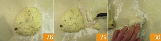 et transférez la pâte sur le plan de travail fariné 28. À l'aide d'une corne, découpez 20 pièces d'environ 50 g chacune 29. Faites des plis rapides 30,