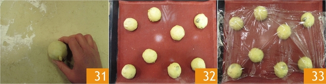 puis formez des boules 31 et transférez-les au fur et à mesure sur une plaque avec un tapis de cuisson de préférence microperforé 32. Couvrez avec le film précédemment huilé 33 et laissez lever encore pendant une heure.