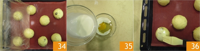Puis enlevez délicatement le film 34. Dans un petit bol, versez un poids égal de crème et d'œufs 35, battez-les et utilisez-les pour badigeonner les maritozzi 36.