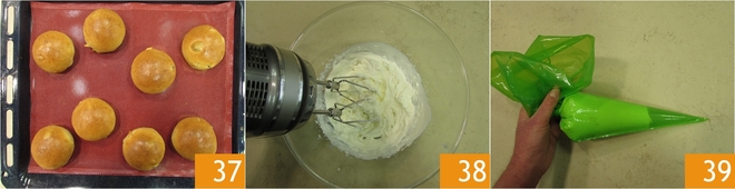 Faites cuire dans un four statique préchauffé à 190°C pendant 7-8 minutes 37, puis sortez du four et laissez refroidir. Montez la crème (sans ajouter de sucre) 38 et transférez-la dans une poche à douille 39.