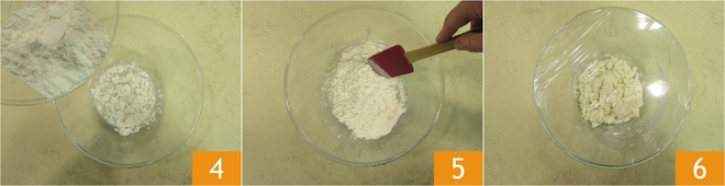 Ajoutez ensuite la farine 4 et mélangez avec une spatule 5, juste le temps d'obtenir un mélange homogène. Couvrez avec du film alimentaire 6.