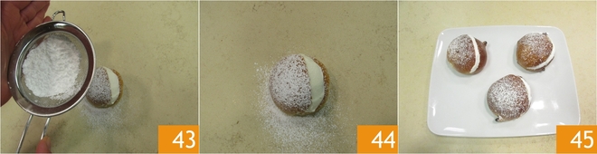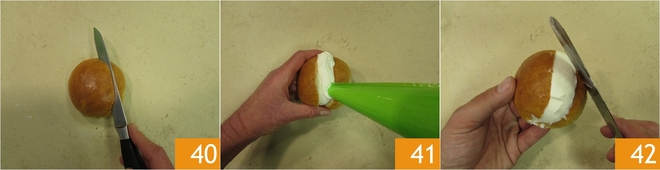 Fendez les maritozzi sur le côté 40, pressez en abondance la crème à l'intérieur 41 et lissez bien avec une spatule 42.
