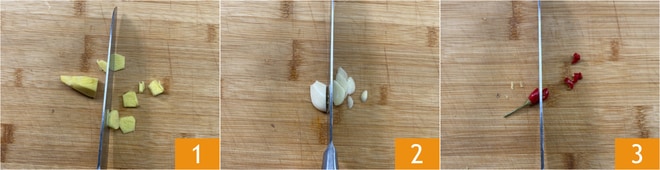 Pour réaliser le masala de pois chiches, commencez par préparer les ingrédients : épluchez le gingembre et coupez-le en tranches 2, puis faites de même avec la gousse d'ail 2. Émincez le piment 3.
