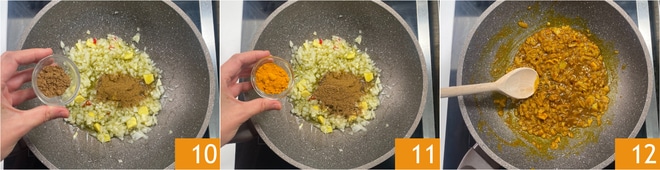 Ajoutez également le cumin 10 et le curcuma 11, puis mélangez 12. Laissez cuire environ 8 minutes à feu moyen-doux.