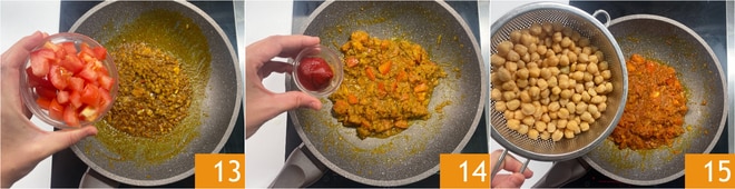 Lorsque l'oignon est ramolli, ajoutez la tomate 13 et le concentré de tomate 14. Après 2-3 minutes, ajoutez les pois chiches que vous aurez préalablement égouttés et rincés 15.