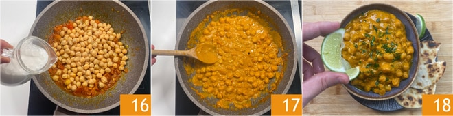 Versez le lait de coco 16, puis salez et mélangez bien. Faites cuire pendant environ 25 minutes, toujours à feu moyen-doux 17. Servez votre masala de pois chiches garni de coriandre et d'un trait de citron vert 18 !
