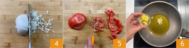 Épluchez et hachez finement l'oignon 4, puis coupez la tomate en dés 5. Faites chauffer un filet d'huile dans un wok ou une poêle antiadhésive, puis ajoutez l'ail et le gingembre 6.