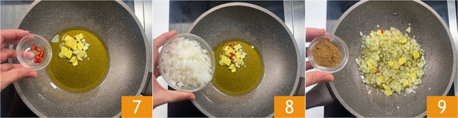 Ajoutez également le piment 7 et l'oignon 8. Après quelques instants, assaisonnez avec le masala 9.