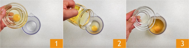 Pour préparer la mayonnaise avec mixeur plongeant, nous vous conseillons de mettre au réfrigérateur quelques heures avant la partie du mixeur avec les lames et l'huile, ainsi que le jus de citron. Prenez l'œuf directement du réfrigérateur. Versez les ingrédients dans un verre haut en suivant cet ordre : l'œuf (en prenant soin de ne pas casser le jaune) 1, l'huile de graines 2, le jus de citron 3 et la pincée de sel.