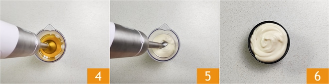 À ce stade, plongez les lames du mixeur jusqu'au fond du verre 4. Actionnez ensuite le mixeur en le gardant immobile jusqu'à ce que la mayonnaise commence à monter 5. À ce stade, déplacez le mixeur avec des mouvements de haut en bas, jusqu'à ce que le mélange soit homogène et bien monté. Ces étapes prennent seulement quelques secondes. Versez la mayonnaise prête dans un bocal avec couvercle ou dans un petit bol 6, en la couvrant de film plastique pour éviter la formation d'une pellicule en surface. La mayonnaise avec mixeur plongeant est prête à être utilisée !