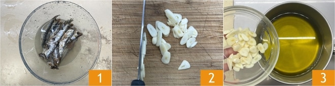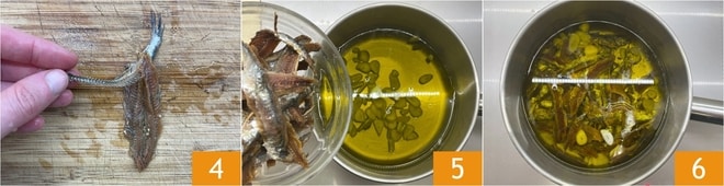 Après le temps de trempage, ouvrez les anchois en deux et retirez l'arête et la queue 4. Mettez les anchois dans la petite casserole 5 et faites cuire pendant environ une heure à feu très doux ; l'huile ne doit pas frémir 6. Pendant ce temps, préparez le bouillon de légumes qui vous servira à cuire le riz.