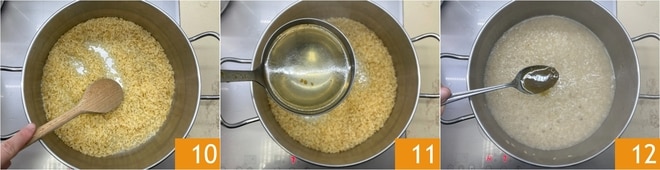 Faites brièvement griller le riz en remuant avec une cuillère en bois 10, puis ajoutez une louche de bouillon à la fois, en attendant toujours que le liquide soit absorbé avant de verser la suivante 11. De temps en temps, ajoutez également une cuillère de bagna cauda, en ajustant la dose selon votre goût 12.
