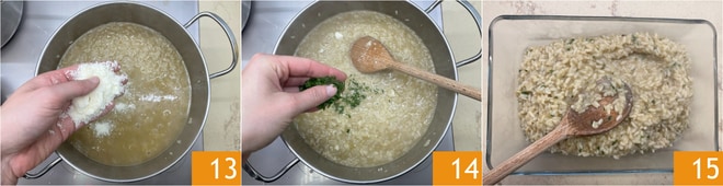 En fin de cuisson, ajustez le sel, puis éteignez le feu et incorporez le Parmigiano Reggiano DOP râpé 13. Mélangez bien, puis ajoutez également le persil frisé haché 14. Transférez le risotto dans un plat allant au four, égalisez la surface 15 et couvrez avec du film alimentaire. Mettez au réfrigérateur jusqu'à refroidissement complet.
