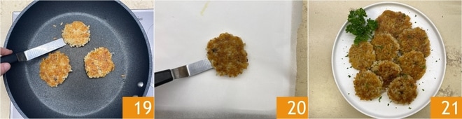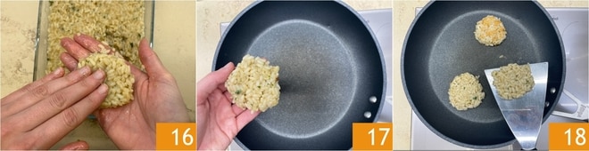 Lorsque le riz est froid, prélevez de petites portions et compactez-les entre les paumes des mains pour obtenir la forme d'un médaillon ; avec ces proportions, vous en obtiendrez environ 8 16. Disposez les médaillons de riz dans une poêle antiadhésive bien chaude 17 et laissez-les griller à feu moyen-élevé sans les toucher. Une fois dorés d'un côté, retournez-les délicatement avec une spatule 18.