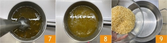 Une fois prête, mixez la bagna cauda avec un mixeur plongeant 7 et réservez 8. Versez le riz dans une casserole chaude, sans ajouter de matières grasses 9.