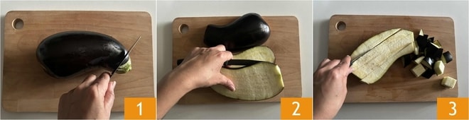 Pour préparer les aubergines à la friteuse à air, commencez par laver les aubergines. Ensuite, posez-les sur une planche à découper et coupez-les aux extrémités 1. Coupez les aubergines d'abord en tranches 2, puis en bâtonnets, enfin commencez à couper en dés plus ou moins réguliers d'environ 1 cm 3.